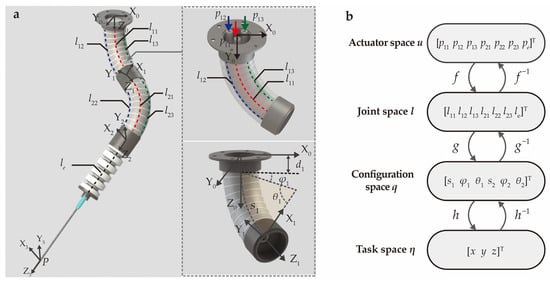 The analytical model of the SoNIM consists of three mappings f, g, and h as shown in Figure 3b. These three mappings describe the relationships among the actuator space u, the joint space l, the configuration space q, and the task space η. Specifically, the actuator space u = [p11, p12, p13, p21, p22, p23, pe]T is composed of the input pressure in the air chambers, and the joint space l = [l11, l12, l13, l21, l22, l23, le]T refers to the corresponding chamber length. The configuration space q = [s1, φ1, θ1, s2, φ2, θ2]T represents the arc parameters of two bending actuators. The task space η = [x, y, z]T represents the position of the needle tip with respect to the global coordinate system {X0 Y0 Z0}.