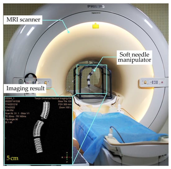 Soft robots present another potential solution to overcome the drawbacks of traditional robots due to their intrinsic compliance and MRI compatibility []. For example, a continuum neurosurgical robot, MINIR, actuated by shape memory alloy (SMA), was proposed for the ablation of brain tumors [,]. With the inherent compliance and small size, MINIR enabled flexible movements of an electrocautery needle in a gelatin slab. But the low actuation speed and nonlinear properties of the SMA hindered the practical application of the MINIR. Fang et al. proposed an MRI-compatible soft endoscopic manipulator (SEM) to achieve the transoral laser ablation of tumors using soft actuators [,]. This work demonstrated the feasibility of soft robots for ablation surgery in an MR environment. However, the SEM was dedicated to noncontact ablations and the needle manipulation function was not considered. The aforementioned prototypes are also summarized in Table 1. It is evident that the design, material, and actuation method are still challenging for surgical robots that manipulate a needle in an MR environment. Therefore, there remains a gap in the knowledge about the effective solution to achieve needle manipulation in the MRI bore while preserving the quality of the MRI.