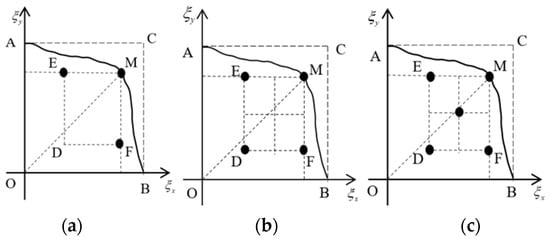 Any point  on the stress boundary curve is considered the highest stress level point of the test plan; in addition,  stress level combinations are restricted to the rectangular area  with OM as the diagonal (as shown in Figure 1). According to the determined stress level combination, with the objective of achieving the highest accuracy of model parameter estimation, the other  stress levels and corresponding sample distribution proportions  are optimized to obtain the test plan. Furthermore, the value of the objective function at each point  on the stress boundary curve  is compared. Finally, the test plan with the maximum value of the objective function is considered the optimal test plan.