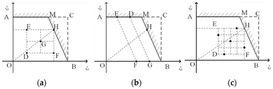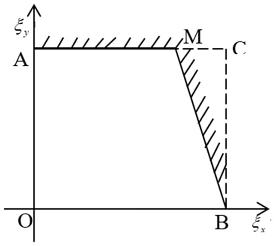 The failure mechanism of an electrical connector under the combined effects of temperature and vibration stress is that the trough filling of fretting wears corrosives at contact pairs, and surfaces contaminated by corrosives increase resistance, leading to contact failure. Thus, its reliability statistical model can be expressed as a linear-extreme model given by Equations (1) and (2). In the reliability evaluation test to assess the performance of the electrical connector, when the temperature stress is taken as the highest level, i.e.,  °C, and the vibration stress is taken as the highest level, i.e.,  []. The electrical connector has contact pairs transient interruption and insulation resistance that exceed the standard values; therefore, its failure mechanism changes, i.e., temperature and vibration stress cannot be taken as their maximum value simultaneously. Considering the limitation that the failure mechanism cannot be changed, after several diagnostic tests, it was found that the temperature and vibration stress satisfy the boundary curve AMB shown in Figure 3, leading to a non-rectangular test area OAMB where the abscissa represents the standardized temperature stress level, while the ordinate represents the vibration stress level []. The equations for the test stress boundary curve in Figure 3 are as follows:
