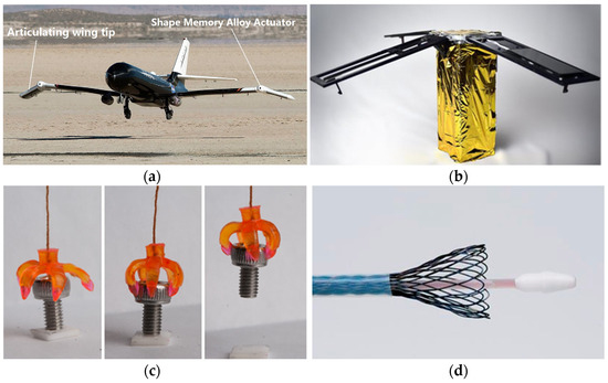 Applications of shape memory materials as well as structures: (a) spanwise adaptive wing using SMA actuator [1]; (b) deploying solar panels by SMA mechanism [2]; (c) soft gripper printed by SMP, and (d) SMA arterial stent [4].