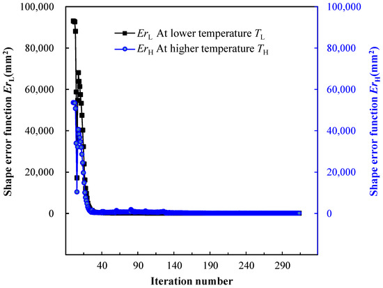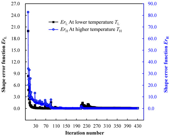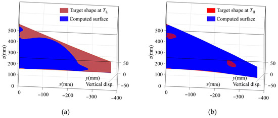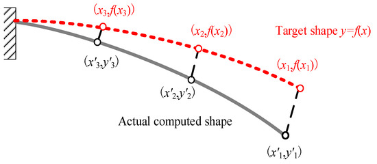 where fL(·) denotes the mathematical function for desired structural target shape at the lower material temperature TL. fH(·) denotes the mathematical function for desired structural target shape at the higher material temperature TH. For the three-dimensional shape error calculation, Equations (20)–(22) can be easily extended with the third coordinate item.