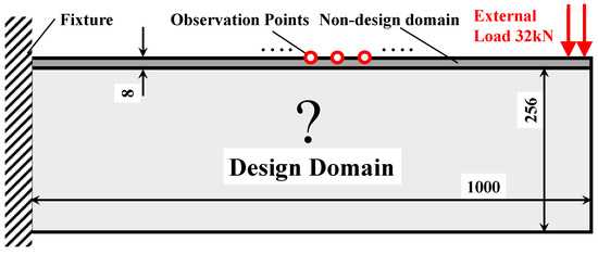 The material parameters are listed in Table 2. The external mechanical load has a magnitude of 32 kN and is distributed uniformly in an area of 24 mm × 8 mm. Material volume fraction upper bound V0 was set as 50%; the density filter radius Rfilter was chosen as four times the average size of the finite elements. In total, 25 × 2 observation points were located equidistantly on the upper surface. To normalize the values of shape error functions, the weighting factor w0,i was chosen as the reciprocal of the desired displacement magnitude at the ith observation point. The shape error function ErH at the material temperature TH was constrained below δ = 0.1.