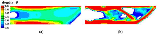 Here, CA and CA0 denote the designed and solid Young’s moduli of the SMA austenite phase. CM and CM0 denote the designed and solid Young’s moduli of the SMA martensite phase. P(·) is the material interpolation function, with pe being the stiffness penalty factor. C0 and Cmin represent the unit value 1 and a small value greater than 0. It should be noted that intermediate density variables introduced artificial simulation responses to the analysis results (see Figure 3). Hence, the three-field scheme proposed by Wang et al. [40] was used in the following proposed topology optimization method. denotes the Heaviside filtered density, which was the physical density for the finite element analysis.