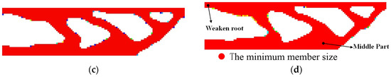 Figure 8 illustrates the topology evolution history of the SMA cantilever beam as the proposed optimization algorithm proceeded. The whole topology-optimization process for SMA cantilever beam took approximately 40 h. After 430 iterations, the topology optimization algorithm found a reasonable local optimum. The iteration history is plotted in Figure 9. The optimized SMA cantilever had a well-defined topological configuration and distinct material boundary, and satisfied the imposed minimum length and scale geometric constraints. The upper part of the fixed root was designed to be weak, and a massive amount of material was gathered in the middle part. This design scheme facilitated the desired slope deformation under the mechanical load.