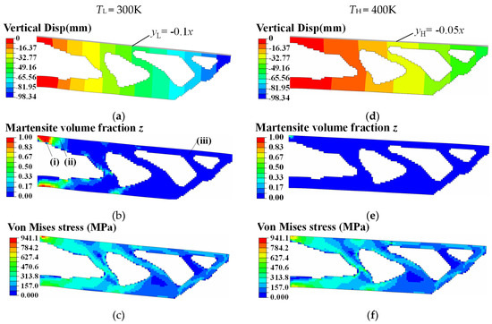 Simulated deformation, phase transformation, and structural stress contours of optimized SMA cantilever at different material temperatures. TL = 300 K. (a) Vertical displacement contour (Min: −98.34 mm). (b) Martensite volume fraction z contour (max: 1.0). (c) Von Mises stress contour (max: 941.10 MPa). TH = 400 K. (d) Vertical displacement contour (Min: −53.63 mm). (e) Martensite volume fraction z contour (max: 0.36). (f) Von Mises stress contour (max: 737.30 MPa).