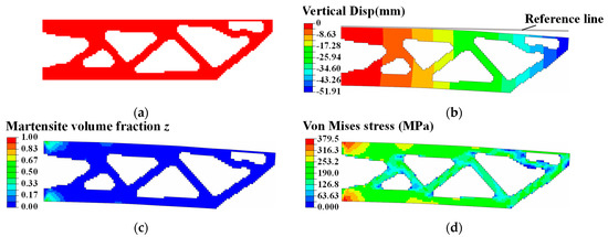Minimizing compliance design of SMA cantilever beam (T = 300 K). (a) Optimized topology configuration. Simulation contours of (b) vertical displacement (Min: −51.91 mm), (c) martensite volume fraction z (max: 0.49), and (d) Von Mises stress (max: 379.50 MPa).