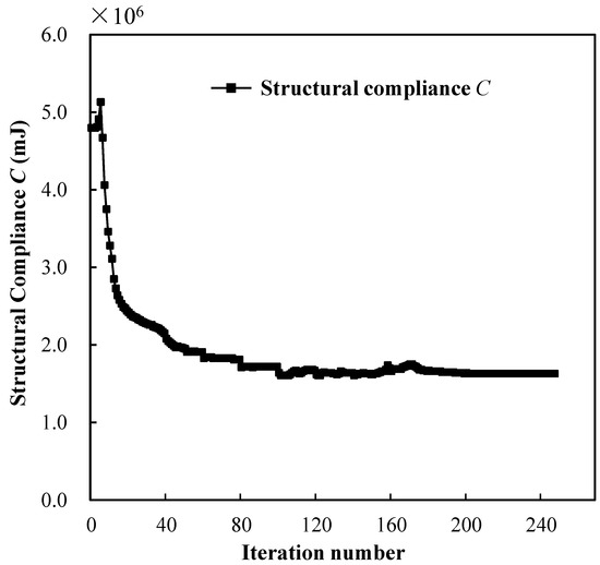 Figure 12 shows the topology-optimized results when we set minimizing compliance as the optimization objective. After 247 iterations, the algorithm evolved to a local optimum. In contrast to the cantilever design in Figure 8d, the SMA cantilever design in Figure 12a had a robust root near the fixture. The loaded upper surface deformed into an arbitrary curve shape, distorting the original geometric shape. A few areas of the SMA material detwinned into the martensite material phase. The maximizing stiffness optimization method was more likely to obtain SMA actuator designs that suppressed the forward transformation from austenite to martensite. The topology-optimization process converged stably, and the compliance iteration history of the optimized SMA cantilever is plotted in Figure 13.