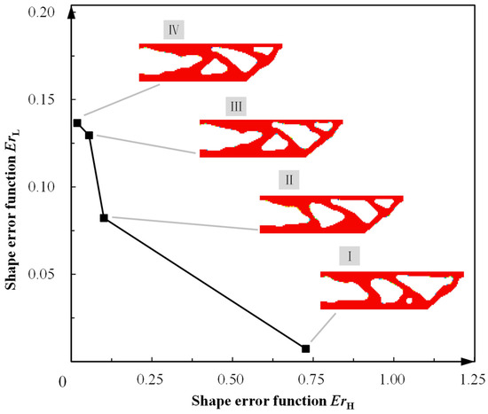 The choice of the upper-bound value δ of ErH affected the topology optimization results, showing the necessity of considering shape error constraints in the prescribed material temperature TH. Figure 14 depicts a set of topology-optimized configurations when we selected different upper-bound values δ of ErH as the optimization criterion. When δ of ErH was set as a relatively large value of 1, the SMA cantilever design with the minimal value of shape error function ErL (about 0.0033) was obtained, as shown in Figure 14, design scheme I. This shows that the upper surface of the SMA cantilever design I approached the expected slope shape yL precisely, while it diverged from the slope shape yH with ErH of 0.7260. As the upper bound δ of ErH decreased from 1 to 0.01 (see designs II, III, IV and V), the SMA material redistributed from the left-side fixture region to the right-side loading region, to satisfy the strict shape error constraint ErH. As a consequence, the shape error function ErL at the material temperature TL increased from 0.0033 to 0.1330. The above results showed that minimizing the values of both shape error functions ErH and ErL was contradictory. Hence, a precision compromise is necessary for two-way shape-morphing designs when the uniform heating/cooling control strategy is adopted.