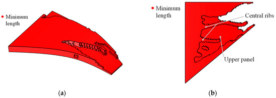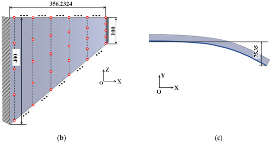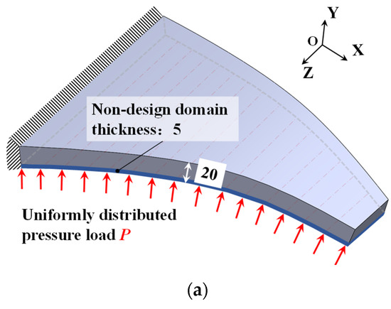 Here, an SMA curved wing design problem for prescribed two-way shape morphing was considered. The material parameters are listed in Table 3. The detailed geometric information of the curved wing structure is depicted in Figure 15. The curved wing structure was discretized with finite elements of averaged 5 mm length scale. A total of 15,556 3D solid finite elements with 60,375 nodes were generated. The upper-bound values δs and δv for geometric minimum length constraints were 9.0 × 10−5. The bottom surface of the curved wing structure was the non-design zone with uniform pressure load P = 0.4 N/mm2. Its thickness is 5 mm. A total of 80 observation points were selected according to Figure 15b. All the weighting factors are chosen as unit value 1. The density filter radius Rfilter = 10 was set as two times the average length of the finite elements.