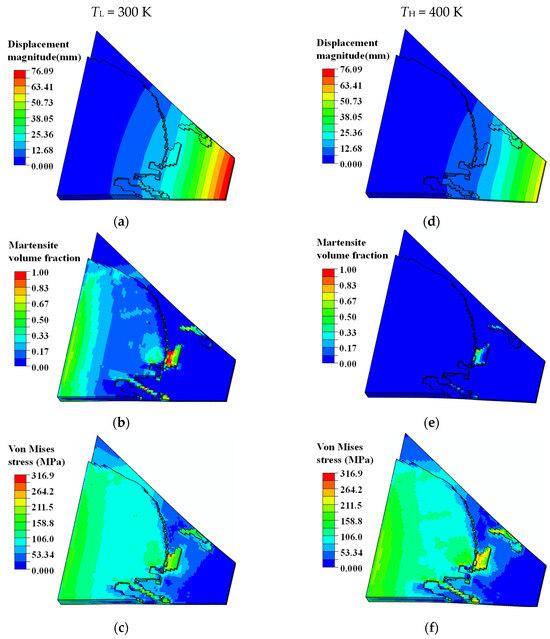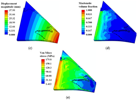 According to the displacement contours in Figure 20a,d, this particular designed enforcement structure compensated for the imbalance of the curved wing geometry configuration and external pressure distribution, resulting in normalized and expected structural deformations. As shown in Figure 20b,e, stress-induced local martensite phase transformation facilitated the deformation of the curved wing structure into the expected plane shape at the material temperature TL. Assuming that the external pressure load was unchanged, the SMA wing bent into the target parabolic shape upon heating the structure to a higher material temperature TH. This was due to the transformation of detwinned martensite to austenite material phase, resulting in a reversible actuation deformation. Although the maximum martensite transformation strain was only 0.8%, the actuation displacement of the wing tip was about 22 mm, which was 1.1 times the total thickness of the curved wing structure.