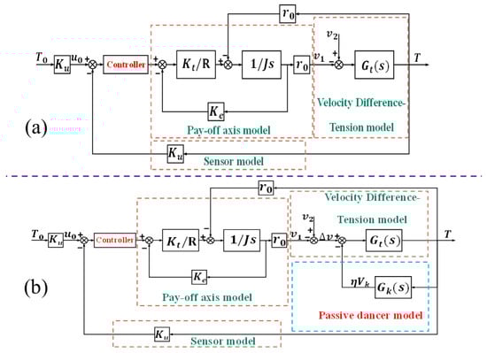Combining Equations (9), (27), (35), (36) and (38), the control framework of the system can be obtained, as shown in Figure 3b. If the passive dancer is disregarded in this system, the control diagram is as shown in Figure 3a.