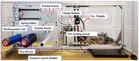 Figure 5 shows the experimental platform of the automatic wire-feeding used to carry out the experiments for verifying the model’s validity. The tow used for experiments was a unidirectional carbon/epoxy tow with a width of 6.35 mm (Type: USN12500/7901). The parameters of the tow are shown in Table 1. In Figure 5, the experimental platform is equipped with two rotating axes, the pay-off axis and the backing paper axis, driven by torque servo motors. The pay-off axis holds the filament roll, while the backing paper axis holds the backing paper roll. The filament roll is the source of tows. As the filament pay-off axis rotates, the tows within the filament roll unwind, allowing the tows to enter the filament bundle conveying mechanism. Meanwhile, the backing paper that wraps around the tows separates from the tows and is collected back onto the backing paper roll. After leaving the filament roll, the tows pass through the guide roller, several guide wheels, and tension sensing device and smoothly enter the filament bundle action mechanism. The bundle action mechanism consists of a clamp module, a tow feeding system, and a cut module. The clamping module is responsible for fixing the position of the tow when the feeding system is not operational. The feeding system is accountable for transporting the tow forward, while the cut module is responsible for cutting the tow.