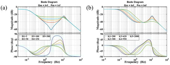 (a) Bode diagram with different damping coefficients (); (b) Bode diagram with different elasticity coefficients ().