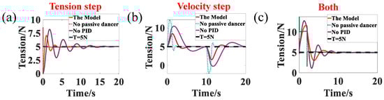 As shown in Figure 9, the tension fluctuations under clamping, retransmission, and laying processes were analyzed, respectively. In Figure 9, compared to the other two systems, the system without passive dancers has a larger and a shorter and . However, for the tension control system in AFP, if the and are excessively short, the motor does not have enough time to respond, and the tension varies rapidly. In this case, the probability of laying defects increases. Meanwhile, for the system without the controller, all indicators are inferior to those with a passive roller and controller. In contrast to the other two systems, the tension control system with the passive dancers and the controller provides a better buffer for the motor and reduces the maximum overshoot significantly, which is better for the AFP.