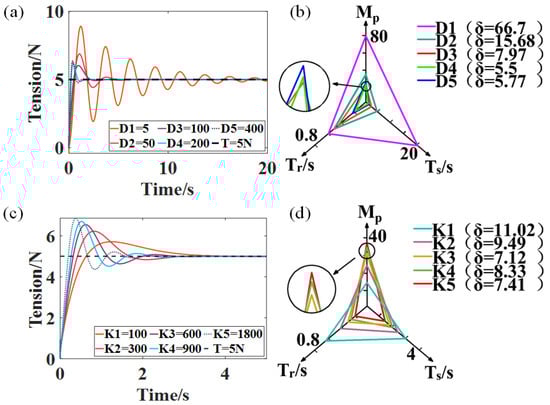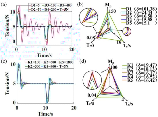 (a) Tension fluctuations in the retransmission phase with different damping coefficients (). (b) Performance analysis of the control system with different damping coefficients. (c) Tension fluctuations in the retransmission phase with different elasticity coefficients (). (d) Performance analysis of the control system with different elasticity coefficients.
