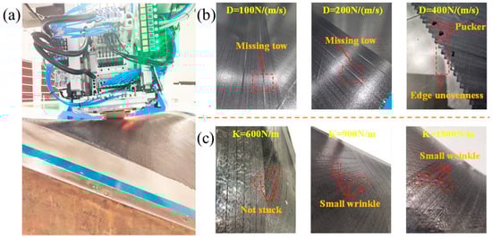 Placement experiments were carried out using the passive dancer parameters selected by the simulation. The test setup is shown in Figure 12a. This study focused solely on investigating the influence of tension on the layup process. In this experiment, only tension was treated as a variable, while the remaining parameters were kept constant. Therefore, we assumed that any observed effects were attributed to the tension system itself rather than changes in other parameters. The experimental results show fewer layup defects are generated when the selected parameters are used for a layup, and the quality is high. As depicted in Figure 12b, the tension fluctuates excessively when D = 400 N/(m/s). Thus, it is easier to obtain pucker and edge unevenness during laying. As for D = 100 N/(m/s) and 200 N/(m/s), there is a missing tow in the laying process, which could be ignored. It can be seen from Figure 12c that the variation in the elasticity coefficient does not have much effect on the layup. When K = 600 N/m, sticking occurs during laying. And when K = 900 N/m and K = 1800 N/m, there are small wrinkles during laying. Since defects are unavoidable, the minor defects caused by changing the elasticity coefficient during the laying process were neglected. In addition, comparing the influence of the damping coefficient and elasticity coefficient on the laying process, it could be obtained that the damping coefficient has a more significant effect. (Note: The results are only for the type of prepreg selected in this paper, the AFP parameters, and the mold used for a layup. If the above conditions change, the simulation and experiments must be reconducted to determine the passive dancer parameters).