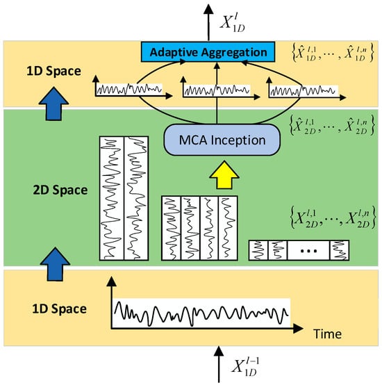 The input sequence first passes through the embedding layer to obtain the depth feature . For the th layer TimesBlock, the input is , after which the 2D temporal variations are extracted by 2D convolution. Its formula is: