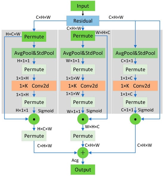 In this paper, we add the multidimensional collaborative attention module MCA [] to the Inception model, which is a lightweight and efficient multidimensional collective attention that utilizes a three-branch architecture to infer the channel, height, and width dimensions at the same time, with a simple and generalized structure, to be easily inserted as a plug-and-play module into a wide range of classical CNN, and to be trained in an end-to-end manner with ordinary networks, which reduces the model complexity and computational burden. The MCA structure is shown in Figure 4, so this step can be expressed as: