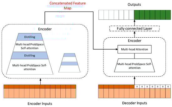 The Informer model improves the Transformer model in response to the secondary computation of the Transformer model’s self-attention mechanism, the memory bottleneck of the long input stacking layer, and the speed plunge of predicting long-term outputs by (1) proposing a ProbSparse Self-attention to efficiently replace the classical Self-attention, which realizes the dependent alignment of time complexity and memory usage; (2) proposing self-attention distilling for downsampling operation, which reduces the number of dimensions and network parameters and helps to receive long sequence inputs; (3) proposing a generative decoder, which requires only one forward step to obtain long sequence outputs and at the same time avoids the inference stage of cumulative error propagation. Its overall framework is shown in Figure 5.