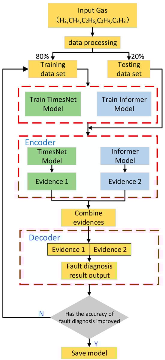 Step 3: Fault diagnosis and parameter optimization. After completing the feature extraction of the transformer DGA data in the above two steps, the coding layer outputs of the two models are spliced as decoding layer inputs to obtain the final results. The model parameters are then validated using the validation set. If the model’s accuracy on the validation set is improved, the current model parameters are saved, and the model is updated for further training. Otherwise, the model parameters are modified and retrained until the best model is obtained.