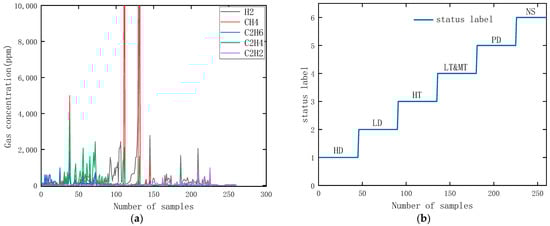 In this paper, 260 publicly available transformer DGA datasets were collected. The gas contents used in five commonly used dissolved gas analysis methods in oil, namely H2, CH4, C2H6, C2H4, and C2H2, were adopted as the criteria for fault diagnosis. The data were classified into six categories according to the type of faults [], namely, high-energy discharge (HD), low-energy discharge (LD), high-temperature overheating (HT), low and medium temperature overheating (LT&MT), partial discharge (PD), and normal (NS) six classifications, and the data were divided into the training set and test set in the ratio of 8:2. The five gas concentrations and their state labels for each sample are shown in Figure 9. The details of the training and test set samples are shown in Table 1.