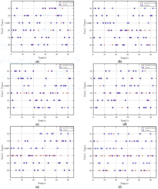 Fault diagnosis results of each method. (a) Methodological result of this paper; (b) Informer result; (c) Autoformer result; (d) Transformer result; (e) DLinear result; (f) MICN result.