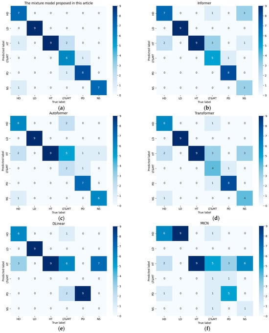 Confusion matrix for each method. (a) Methodology of this paper; (b) Informer; (c) Autoformer; (d) Transformer; (e) DLinear; (f) MICN.