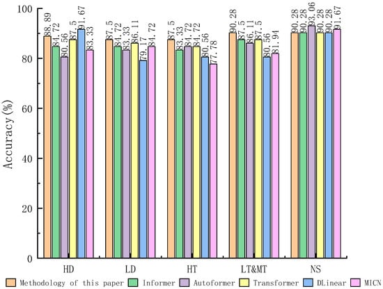 To verify the performance of the proposed method on different DGA datasets, the proposed method is experimentally validated on another publicly available 350-group DGA dataset. Unlike the previous dataset, the distribution of faults in this dataset is more uneven. The fault types are different from the previous one, which are divided into five types: high-energy discharge (HD), low-energy discharge (LD), high-temperature overheating (HT), medium-low-temperature overheating (LT&MT), and normal (NS), which are also divided into the training set and the test set in the ratio of 8:2. This dataset is more complex and better reflects the actual situation of transformer failure during operation. Its data division is shown in Table 5. In this experiment, the models were evaluated under the same conditions, and their results are shown in Table 6. Figure 12 shows the recognition accuracy of different models for each fault.