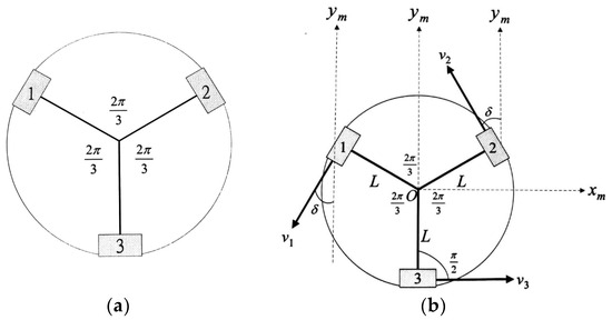 The omnidirectional WMR can move along any angle [21,22]. The structure of the omnidirectional wheels and the coordinate system are shown in Figure 2 [23], respectively. The WMR has three omnidirectional wheels, separated by an angle of 120°. O denotes the WMR center. The length between O and an omnidirectional wheel is L. Counterclockwise and clockwise movements of the wheels are considered positive speed and negative speed, respectively. The road speed of omnidirectional wheel 1 is v1, that of omnidirectional wheel 2 is v2, and that of omnidirectional wheel 3 is v3. The center of the omnidirectional WMR coordinate system is denoted as xm and ym, and δ, the angle between v1 (or v2) and ym, is 30°. The angle between v3 and ym is 90°.
