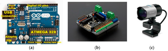 (a) Arduino Uno R3 [15], (b) DFRduino IO Expansion board, and (c) Microsoft LifeCam.