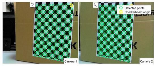 Camera calibration determines a camera’s internal parameters, external parameters, and rotation matrix. The external parameters are the transformations describing real-world and camera coordinates. These parameters are used to identify the relationship between the imaging and actual object positions. In this study, we applied the Zhang Zhengyou calibration method [31], which requires numerous samples for position calculation. Some of the samples are shown in Figure 4.