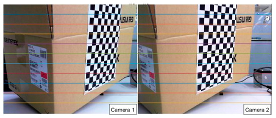 The stereo rectification step is performed to ensure that the two images correspond after distortion correction. In this step, the epipolar lines of the two images are on the same horizontal line so that one point in one of the images corresponds to the same point in the other image, as shown in Figure 5.