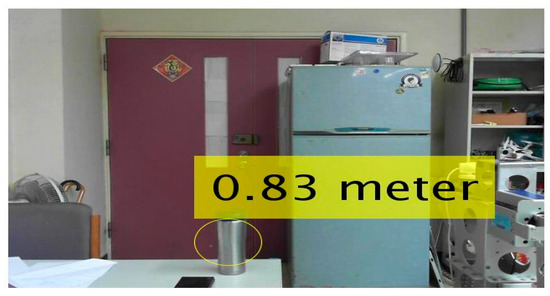 When the robot is turned on, the onboard computer displays the image captured by the depth camera, as shown in Figure 18. The three circles in the picture represent the nearest left, center, and right distances, respectively. This representation makes it easy for users to identify which objects are detected by the robot. The distance and direction of the action are displayed after the obstacle detection process, as shown in Figure 18. On the depth camera image, the distances of the nearest left, middle, and right objects are greater than 2 m, so the action is GO. At the starting position, the robot does not detect any obstacles, so the control scheme sends the “go” command, which tells the robot to go straight.