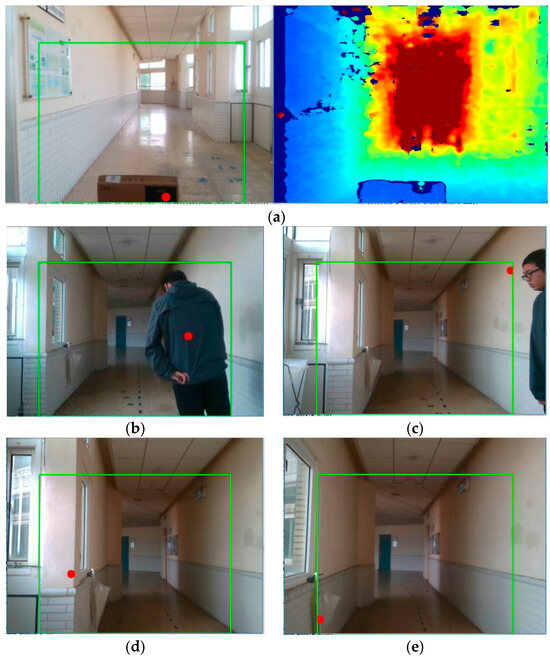 Detection of different obstacles: (a) obstacle detection and obstacle depth map, (b) nearest obstacle point is on the right side, (c) move to the left and the obstacle is outside the safe frame, (d) nearest obstacle point is on the left side, (e) move to the right and the moving direction is clear.