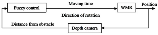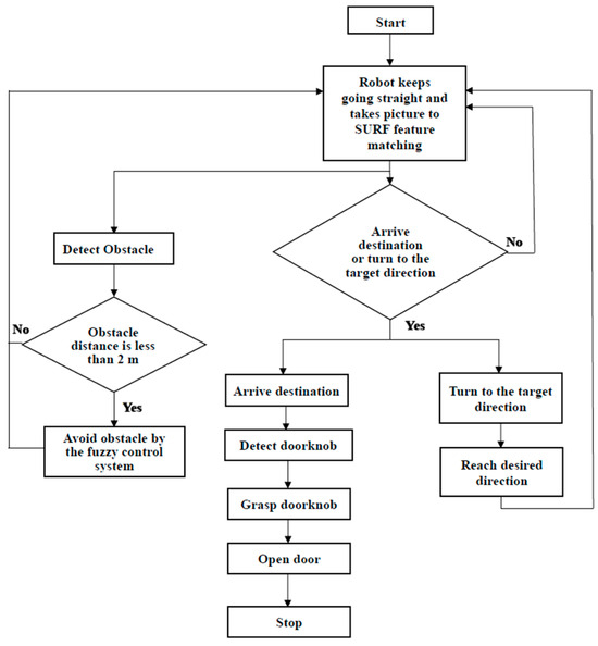 This study mainly revised the traditional ranging paradigm. Range detection was realized by using an Intel Realsense depth camera. After computing the distance of an object, fuzzy theory was applied to avoid obstacles. During robot motion on a path, we used the speeded up robust features (SURF) algorithm to compute the robot’s self-position and future trajectory. Moreover, the cameras detected the static and dynamic obstacles encountered on the path. After arriving at the designated position, the control scheme used HoughCircles to identify a circular object so that the arm could find the doorknob and claw the door handle. Our experimental results indicate that the proposed visual control scheme can facilitate omnidirectional obstacle avoidance and help the robot move to a designated location and open the desired door. Compared to other relative research, most of them utilized laser and ultrasonic sensors in robot navigation [18,19]. To make the robot human-like, the proposed WMR system only uses visual information to avoid obstacles, navigate indoors, identify the door, and guide the robot arm to reach the doorknob. In addition, a simple fuzzy system is implemented in the control process that can reduce the computing time and is suitable for real-time control.