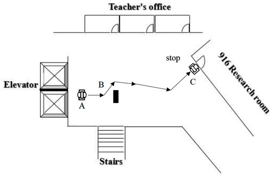 This study integrated obstacle avoidance and route navigation into the omnidirectional wheel robot. The control sequence is presented in Figure 11. The robot will follow a planned path with specified features. From the original starting point, the robot moves straight forward to the next specified feature point. When the robot reaches the desired midway point, it searches the destination point through feature matching and turns to the target’s direction. When the destination features are matched, the robot moves forward to the destination point. When the robot reaches the destination point, arm control is activated. A detailed arm control process is shown in Section 4.3. If an obstacle is found on the pathway, the robot performs obstacle avoidance control (Section 4.2), as shown in mark B in Figure 12. After avoiding the obstacle, the robot moves back to the planned path to the desired midway point before mark C in Figure 12.
