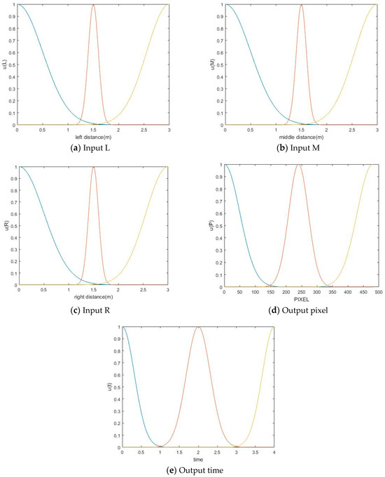 To simplify the calculation process, other than neural network mobile robot control [34,35], fuzzy control is used in obstacle avoidance to allow the robot to avoid obstacles accurately [36]. The fuzzy control of obstacle avoidance uses three inputs and two outputs. We cut the camera’s pixels into three parts: left (L), medium (M), and right (R). Each part detects the nearest obstacle and returns the distance function between the obstacle and the robot. The distances of these three obstacles are the three inputs of the fuzzy control scheme, and the fuzzy sets are near, medium, and far. The outputs are time (T) and pixel (P). The output time (T) is used to control the rotation time of the wheel, and the fuzzy sets are long (LG), medium (MD), and short (ST). The pixel (P) controls the direction of rotation. The fuzzy sets are turn_right (TR), turn_left (TL), and go_straight (TM), as shown in Figure 13, and the fuzzy control models are shown in Figure 14. The fuzzy control scheme is shown in Figure 15.