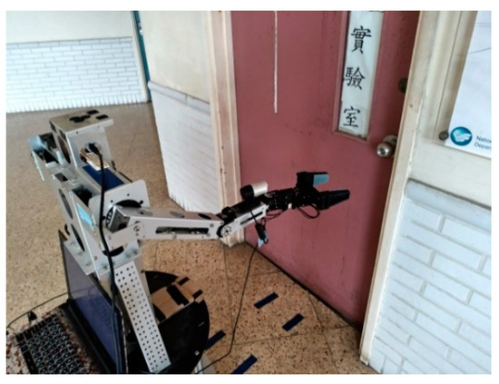 When the robot reaches the specified position, its arm is automatically lifted to the height of the doorknob, and the camera installed on the arm is activated to start tracking the doorknob, as shown in Figure 16. The robot determines the position of the doorknob and judges the required direction of movement [37]. The directions of movement are left rotation, right rotation, left parallel translation, and right parallel translation. We set two threshold values: the return position is greater than the threshold and lower than the threshold, and the corresponding motions are left and right translations. The times required for each right and left translation movement are 1.2 s and 900 ms, respectively. It is easy to move to the specified range. Then, the left and right rotation movements are performed to finetune the robot’s heading angle so that the robot’s arm points at the doorknob. The movement of each left and right rotation is 5°. When the robot’s position is within these two range values, the robot moves forward. When the distance from the door is shorter than the set distance, the claw of the robot’s arm grabs the doorknob and rotates. After the robot claw has turned the doorknob, it pushes the door forward and opens it.