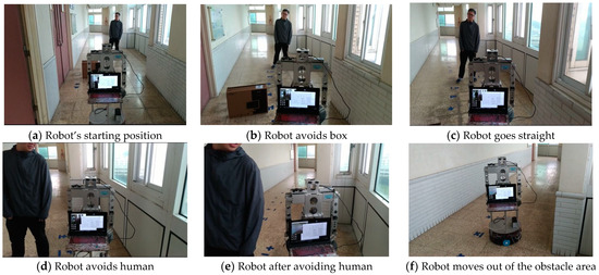 We placed two obstacles in front of the robot. The robot was expected to avoid all obstacles without any route planning. After detecting an obstacle, the robot estimated the direction to move, as shown in Figure 17.