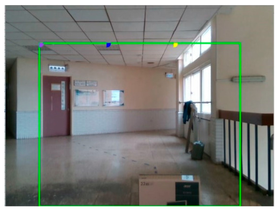 We set up a frame, as indicated by the green square in Figure 8. This frame represents the safe range of the omnidirectional WMR in terms of bumping into an obstacle. Then, we computed the distance of every pixel from the depth webcam for this frame and divided this frame into three parts (left, middle, and right) [14]. After that, we computed the minimum distance between the robot and an obstacle. Given the left distance, middle distance, and right distance, we can determine which obstacle is closer to the robot and identify the position of that obstacle.