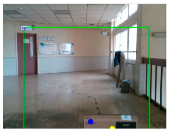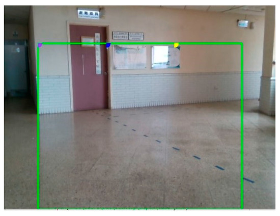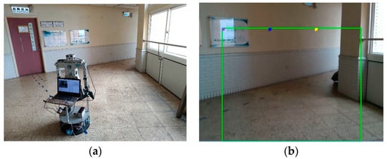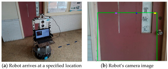 The robot’s walking process always uses SURF for target matching. When the target (predefined door) is matched, the control process shows the matching position and the robot’s movement direction. The robot moves forward to the predefined door and stops 1 m ahead of the door, as shown in Figure 25a. The robot stops moving when it arrives at the specified position. According to the image captured by the robot’s camera, the control process shows that the robot has arrived at the specified location, as shown in Figure 25b.