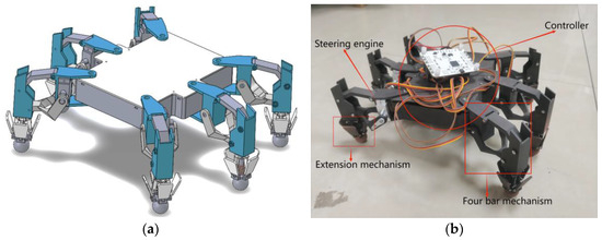 The development process of legged robots can be traced back to the mid-20th century. With the continuous research and improvement of robot technology by scientists and engineers, legged robots have made significant progress in different fields. In the 1960s, significant progress was made in the research of legged robots [15]. Researchers such as Marvin Minsky and Seymour Papert from the Massachusetts Institute of Technology in the United States developed early legged robots such as “Walker” and “Shakey”, which can perform basic walking and obstacle avoidance tasks [16]. In the 1980s, research on legged robots further developed, including more advanced perception technologies and control systems. The Japanese company “Honda” has developed “P2”, a bipedal robot with high stability and human gait simulation [17]. The “Leg Lab” team at Carnegie Mellon University in the United States has developed various bipedal robots for studying gait control and robot stability [18]. Since 2014, Delft University of Technology has been working hard to send the world’s smallest and lightest lunar hexapod robot to the Moon. Its design inspiration comes from cockroaches, which have claw shaped track teeth on their legs and can explore terrain well [19]. Among many legged robots, the most typical is the hexapod robot, which has good overall stability and lower energy costs. Hexapod robots have more support points compared to bipedal and quadruped robots, resulting in a more uniform distribution of weight during movement, reducing the load on individual support points, and being able to adapt to different terrains and tasks by adjusting the support points. They have a higher stability and a lower likelihood of swaying and overturning. On the other hand, although the eight legged robot is relatively stable, its energy efficiency is relatively low [20]. Therefore, hexapod robots have great potential value and can cope with many challenges. The traditional hexapod robot has 18 degrees of freedom, which requires a large number of actuators and high computational power to coordinate the robot’s motion. By reducing drive design, robots can achieve higher power to weight ratios while maintaining high levels of mobility and reduce the complexity of control systems.