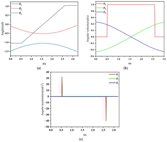 Graph of motion variables of each joint: (a) rotation angle; (b) angular velocity; (c) angular acceleration.