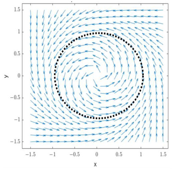 Among them, x and y are the state variables of the oscillator, which are the self-excited oscillation function of time t, that is, the output of the oscillator. α is the convergence rate coefficient used to control the convergence rate of the limit cycle, which is a normal number, and the larger the limit cycle, the faster it converges; μ is the square of the oscillator amplitude; and ω is the oscillation frequency of the oscillator. When there are no special circumstances, it is generally selected α = 100, μ = 1, ω = π. After running through Matlab, you can visually see the limit cycle of the Hopf oscillator, as shown in Figure 9.