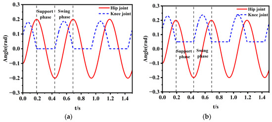 where: k0 is the mapping coefficient of the hip joint; k1 and k2 are the mapping coefficients of the knee joint; while b1 and b2 are the closure coefficients of the extension mechanism when controlling the mechanical leg to contact the ground. As shown in Figure 10, the signal of the y-curve will appear positive and negative. When the leg is in the support phase, the knee joint needs to remain stationary, so only the positive part is taken. Combined with the mechanical structure parameters of the lunar exploration hexapod robot in this article, k0 = 0.4, k1 = 0.3, and k2 = 0 are taken. When walking on the lunar pothole surface, if the extension mechanism of the robot is deployed when it lands, the walking will be more stable. At this time, b1 = 0, b2 = 0, and the signal is shown in Figure 11a. When walking on a flat section of the lunar surface, the deployment of the extension mechanism is no longer necessary, and the steering gear can have an initial angle of b1 = 0.05 and b2 = 0. As shown in Figure 11b, when the 0.19–0.41 s robot is in the support phase, the knee joint will have an initial angle, which will not push the U-shaped carriage. Therefore, the angle range of the knee joint can be adjusted by controlling the size of k1 and b1, thereby controlling the expansion and closure of the mechanical toe extension mechanism. The analysis of both cases is the same, and this article selects b1 = 0 and b2 = 0 for analysis.