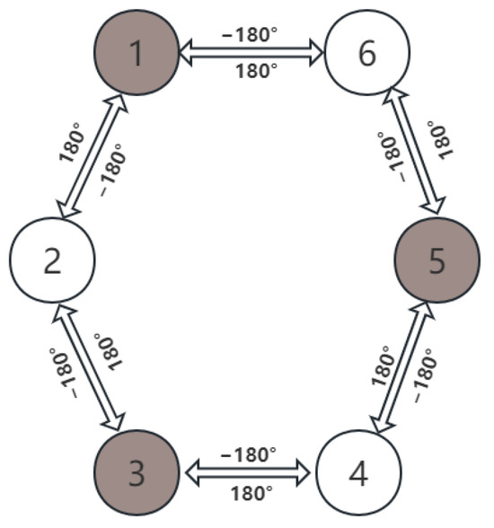 The single leg signal has already been generated in the previous section, and the oscillators of the robot’s single leg need to be coupled with each other to continuously output the signal in order for the lunar exploration hexapod robot to adopt a three-legged gait. This article adopts a ring coupled network topology as the signal output [26], and its mathematical model is