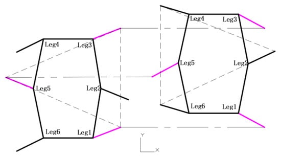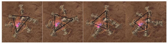 From Figure 14, it can be seen that when the robot is traveling straight, Legs 1, 3, and 5 are in the swinging phase from 10.1 s to 10.3 s, which is the rising phase of the hip joint signal. At this time, if the knee joint rotation angle is greater than 0, it is in the lifting posture, while Legs 2, 4, and 6 are in the supporting phase, which is the falling phase of the hip joint signal. If the knee joint rotation angle is 0, it is in the contact posture with the ground, and the support points of the three legs are triangular. From the schematic diagram 15 of the robot’s straight travel, it can be seen that during straight travel, Legs 1 and 3 swing in the same direction, while Leg 5 is opposite to both. This can be reflected in the fact that when Legs 1 and 3 rotate clockwise, Leg 5 rotates counterclockwise, forming periodic motion in conjunction with Legs 2, 4, and 6.