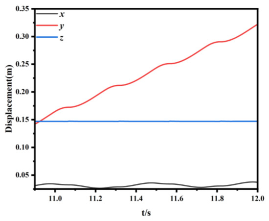 Figure 15 shows the displacement curves of the robot’s center of mass in the x, y, and z directions. The directions of y and x are consistent with Figure 14; y is the forward direction of the robot, x is the right offset direction of the robot, z is perpendicular to the ground and is in the opposite direction of the force of gravity on the robot. From Figure 15, it can be seen that the robot walked 0.32 m in 12 s when traveling straight, and its centroid had a maximum amplitude in z-direction of 2.1 × 10−4 m, and a maximum offset in x-direction of 3.1 × 10−3 m, with very small fluctuation amplitude and offset. From Figure 16, it can be seen that the speed of the robot experiences positive and negative fluctuations in the coupling of its six legs in the first 9 s. After 9 s, the speed is very smooth and the average speed is stable. The acceleration of the robot also increases instantly at the beginning, but the fluctuations are very small after 9 s. The simulation of the gait shows that the lunar exploration hexapod robot adopts a reasonable gait design. When walking straight ahead, the robot’s motion is very smooth and maintainable.