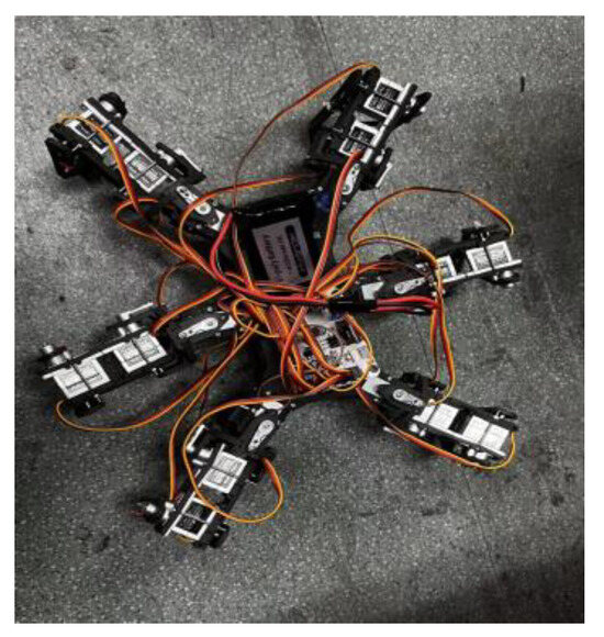 The physical illustration of the traditional hexapod robot is depicted in Figure 17, featuring a total of 18 degrees of freedom with three active degrees of freedom for each leg. The elliptical layout of the legs, construction materials, servos, and input signals for the traditional hexapod robot are consistent with those of the lunar exploration robot. The walking scenario is illustrated in Figure 18, where the leg landing points form a triangular support, and the movement of the two leg groups exhibits periodicity. According to actual measurements, the prototype walked approximately 150 mm in 12 s. However, the traditional robot encounters a situation of stationary stepping due to insufficient support force caused by the foot sinking into the lunar soil.